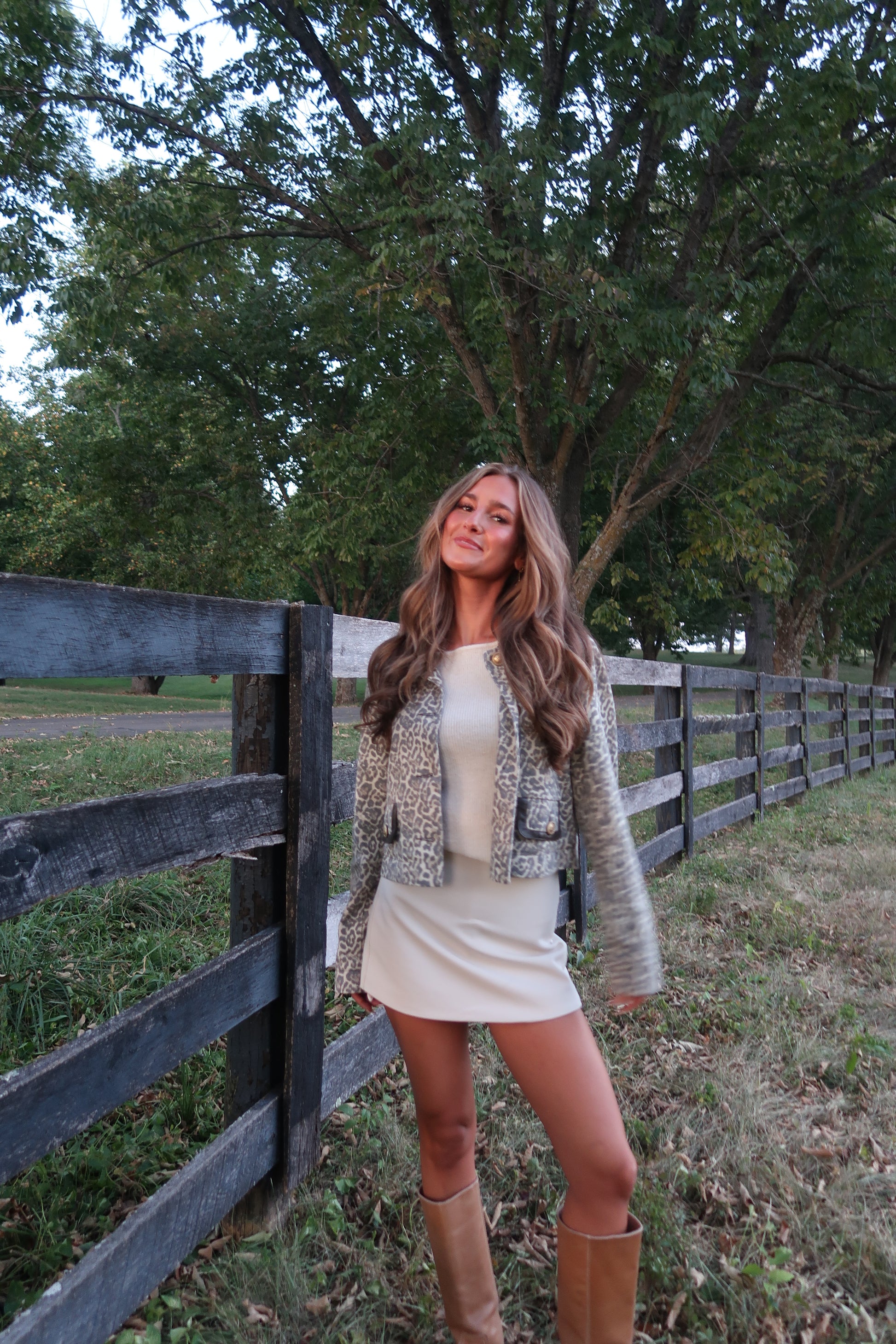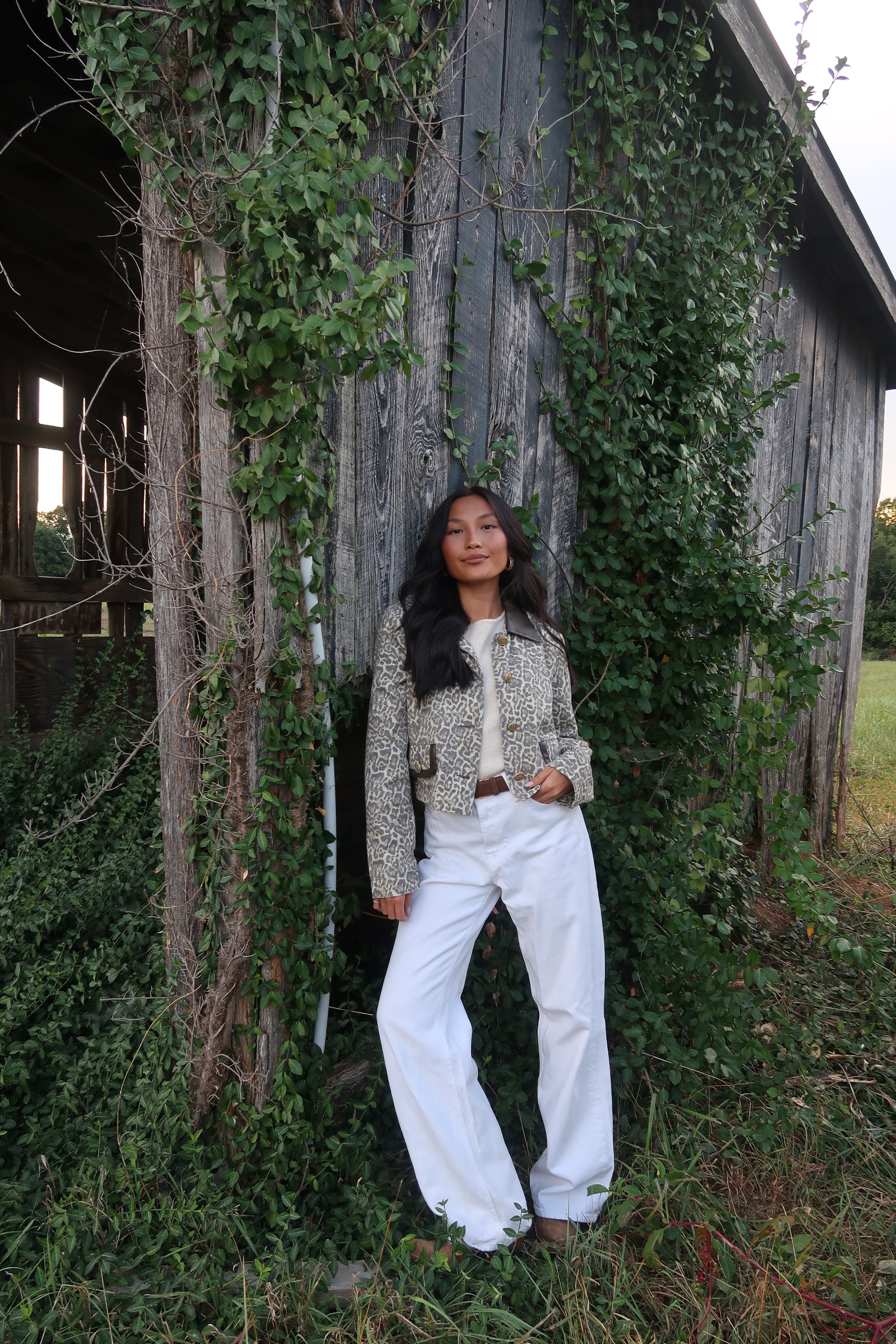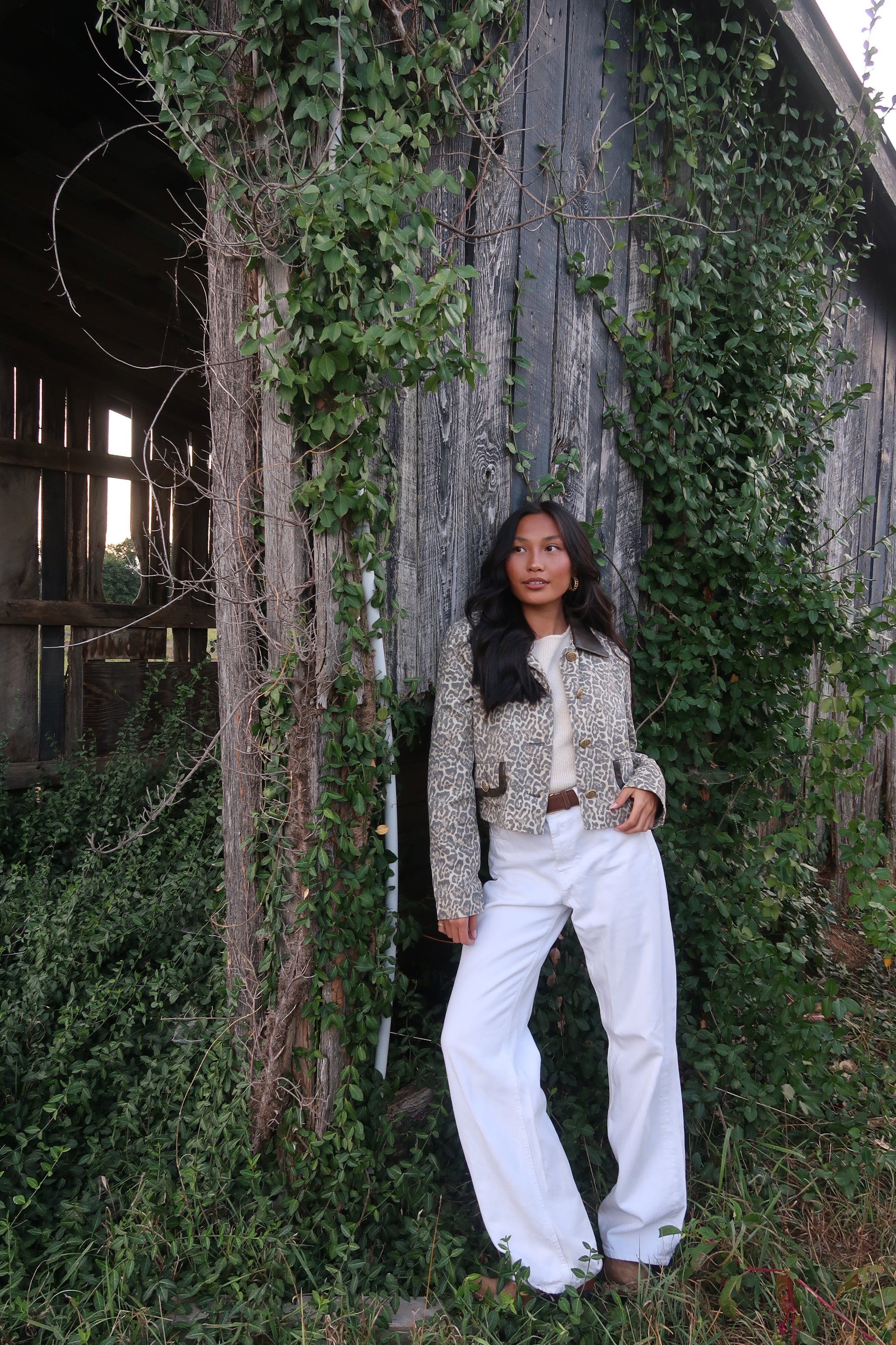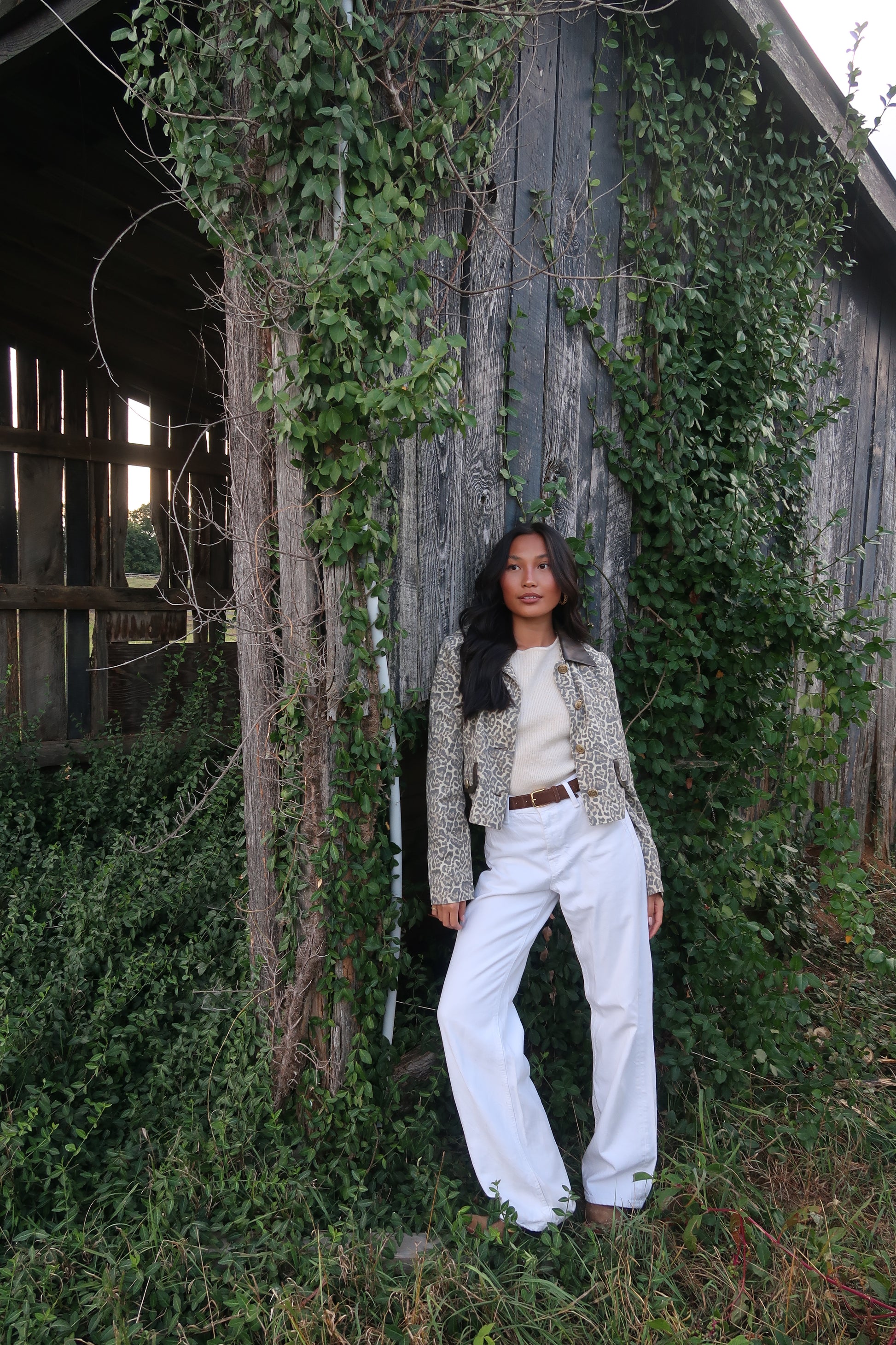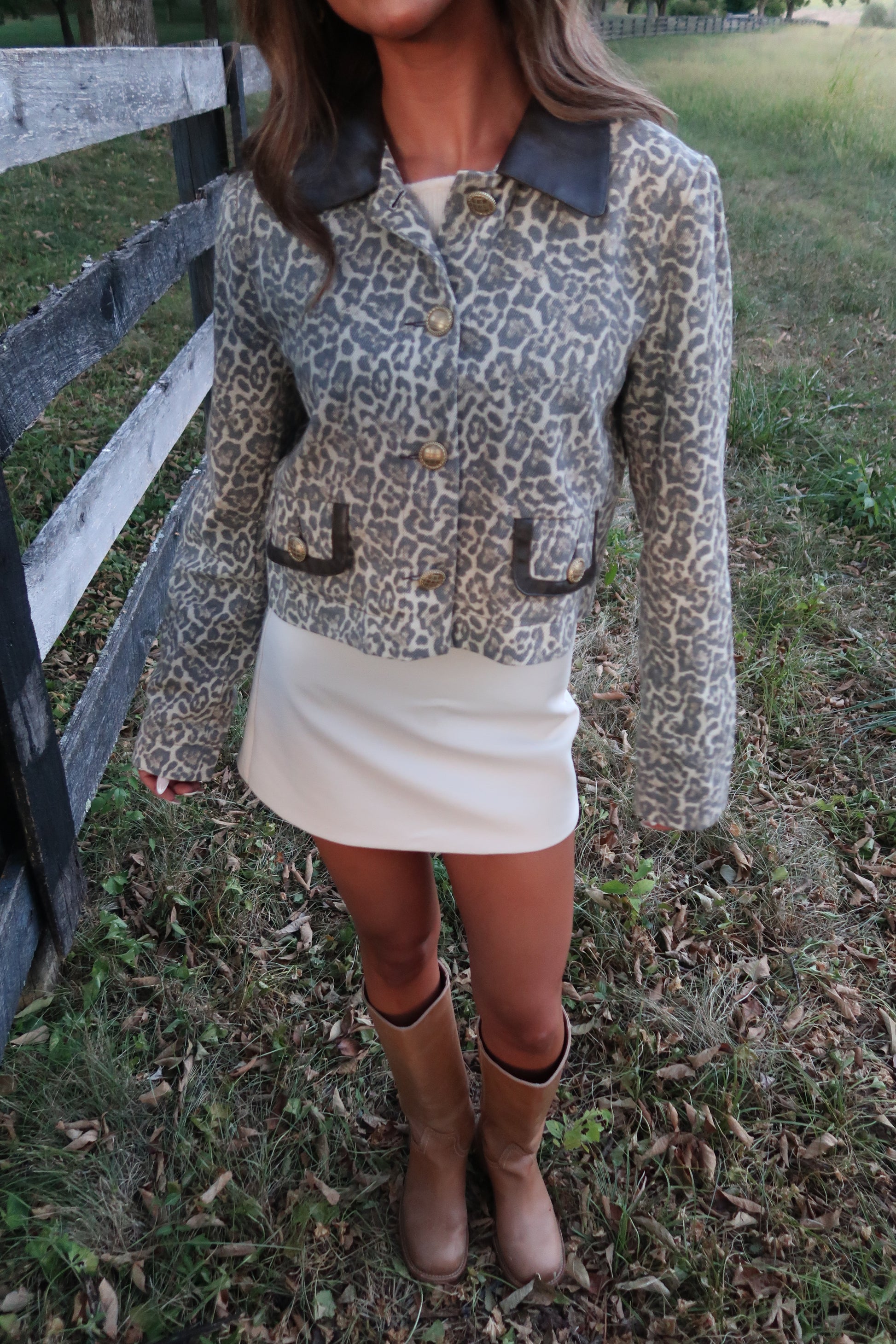 Make a statement this season in the Arden Leopard Jacket — a timeless silhouette with a bold, modern edge. The slightly cropped fit is elevated by contrasting trim along the collar and flap pockets, while luxe gold buttons add the perfect touch of polish. Fully lined and crafted from a soft, structured fabric, it’s the ideal layering piece to carry you from countryside mornings to evenings in the city.