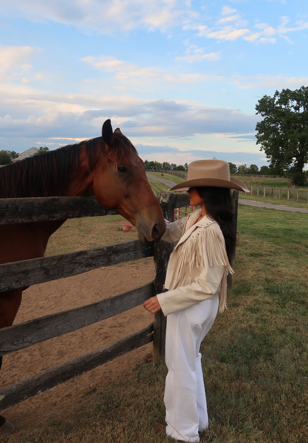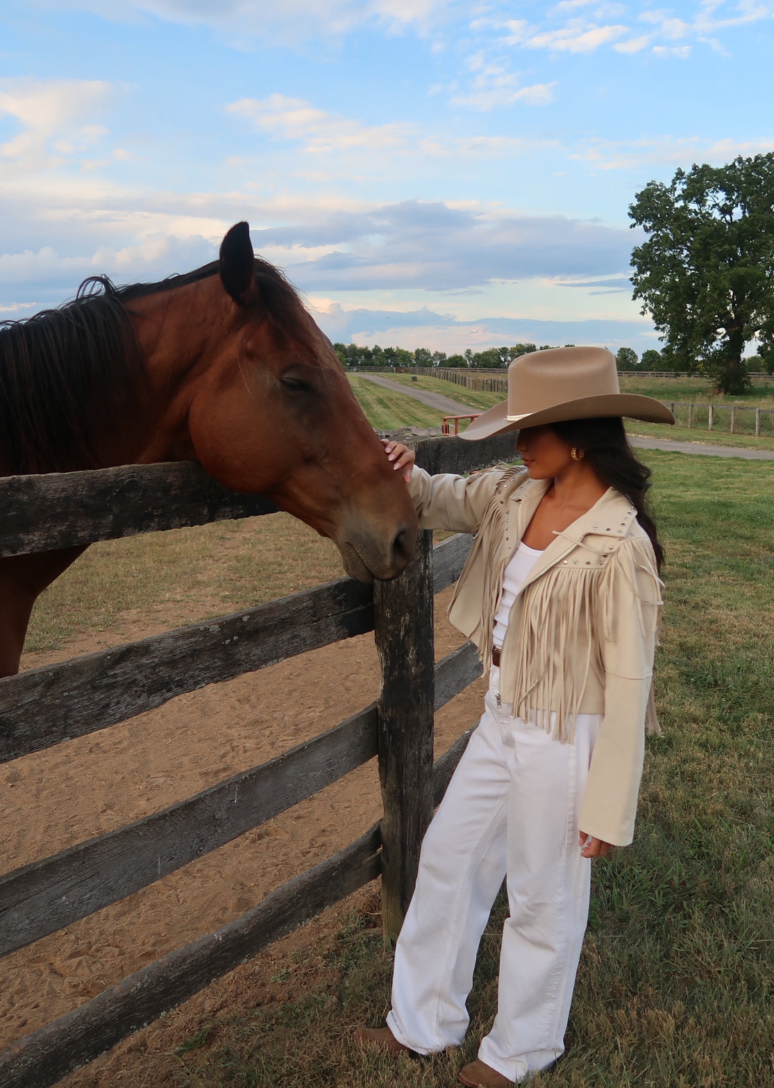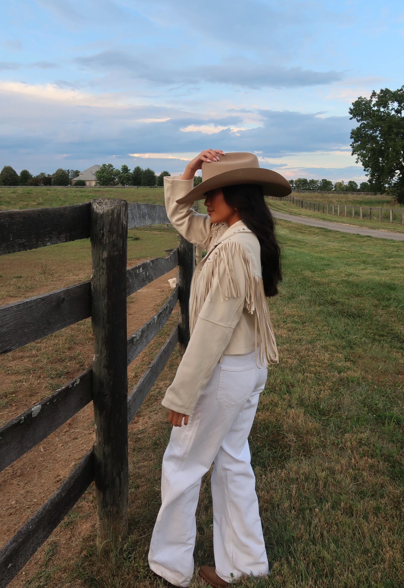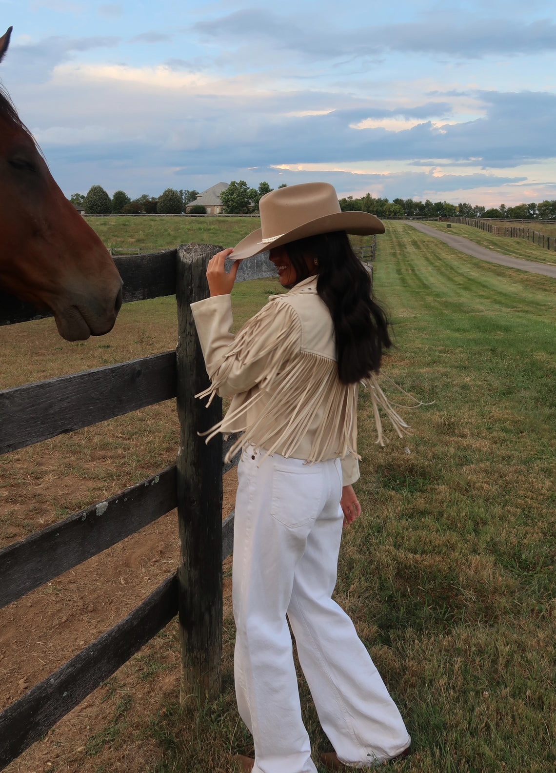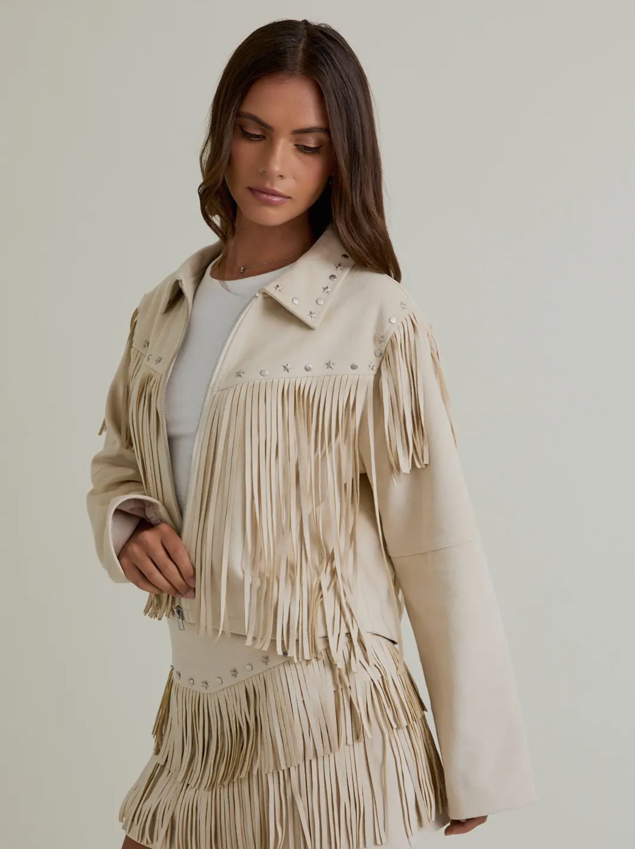 The statement piece your fall wardrobe has been waiting for. Crafted in a buttery-soft suede, the Beaumont Jacket features an effortless relaxed fit, studded detailing along the collar, and cascading fringe that moves with you for that perfect Western-inspired edge. Equal parts chic and bold, it’s the jacket that instantly turns any look into a standout moment.