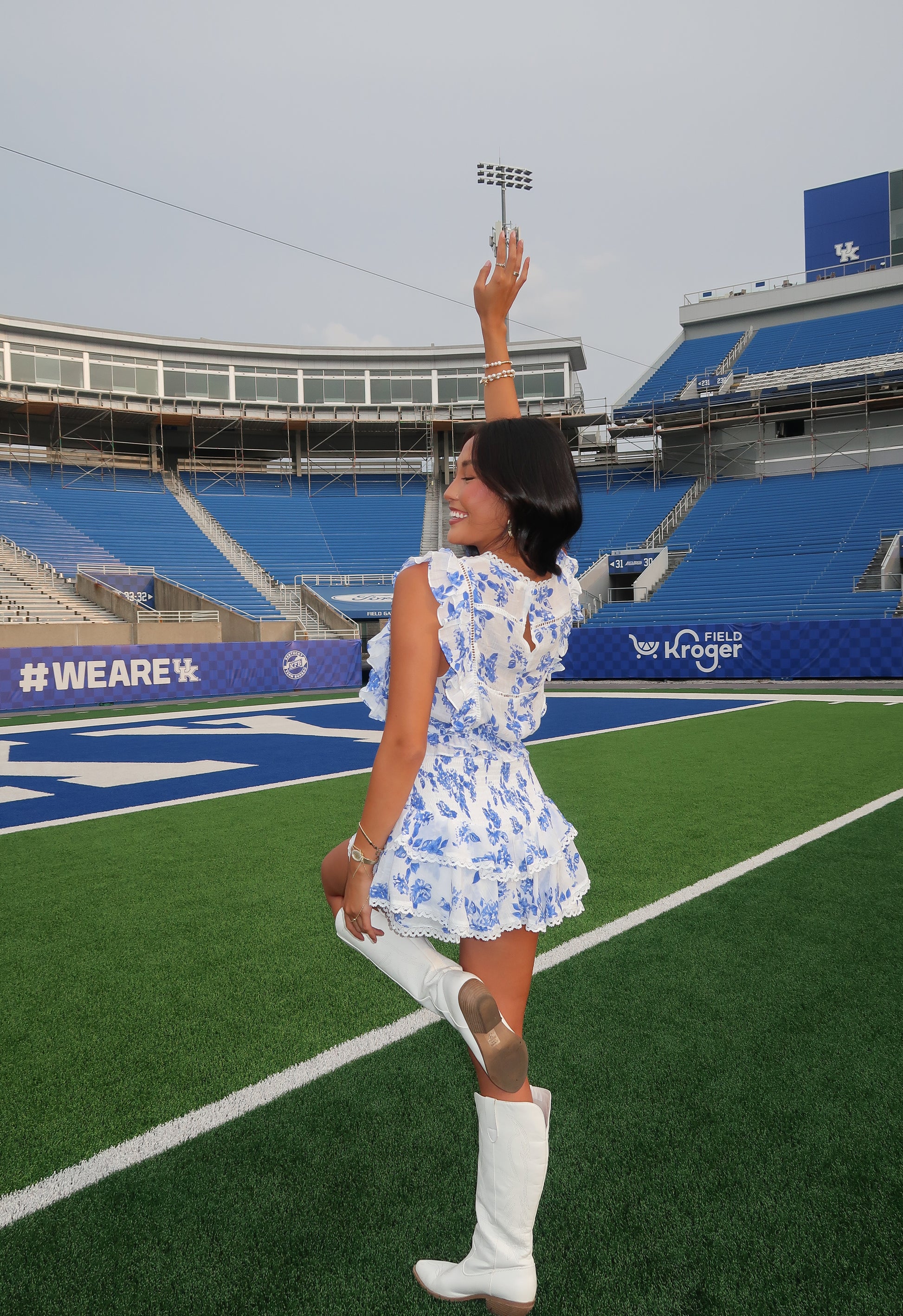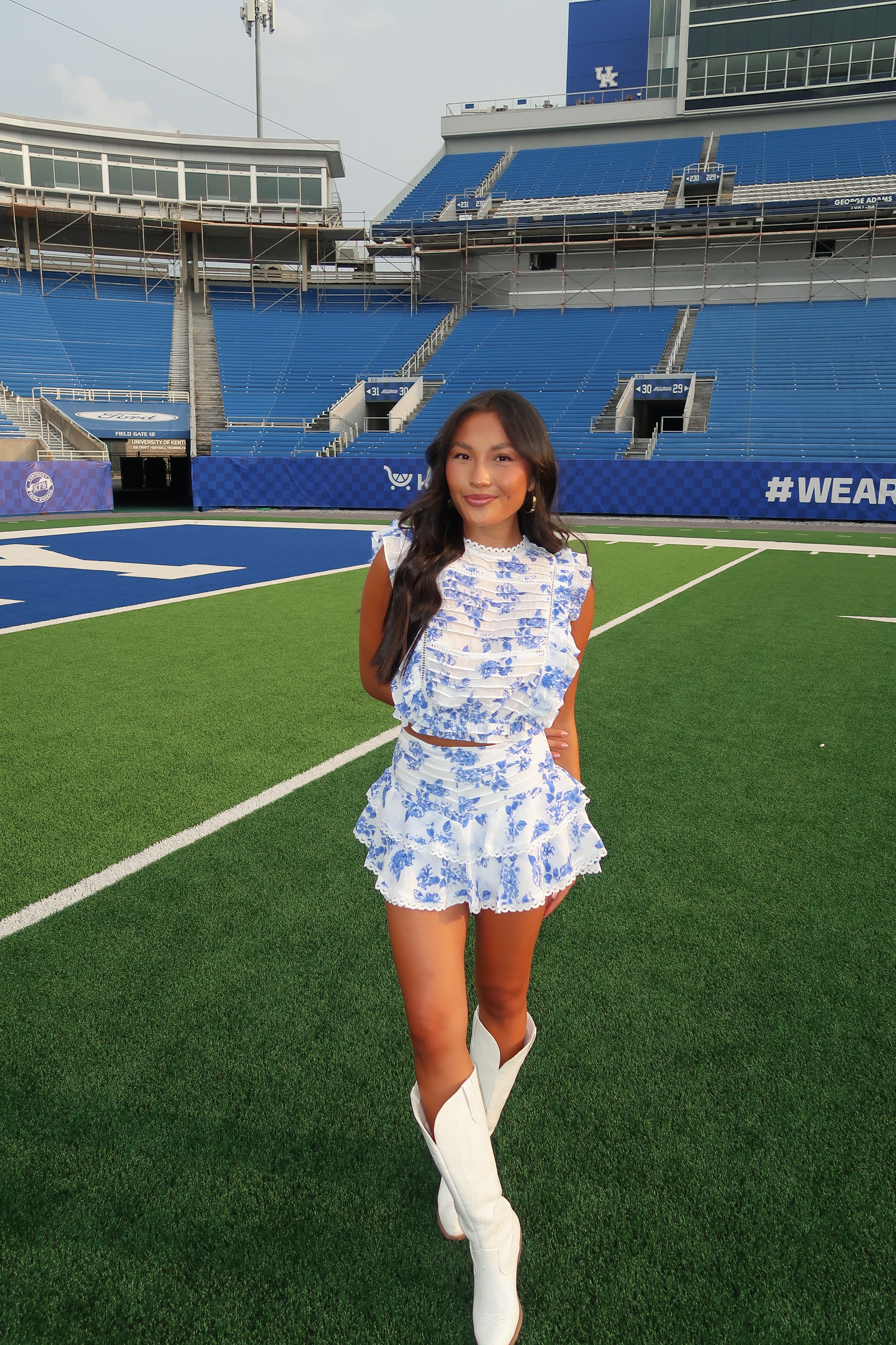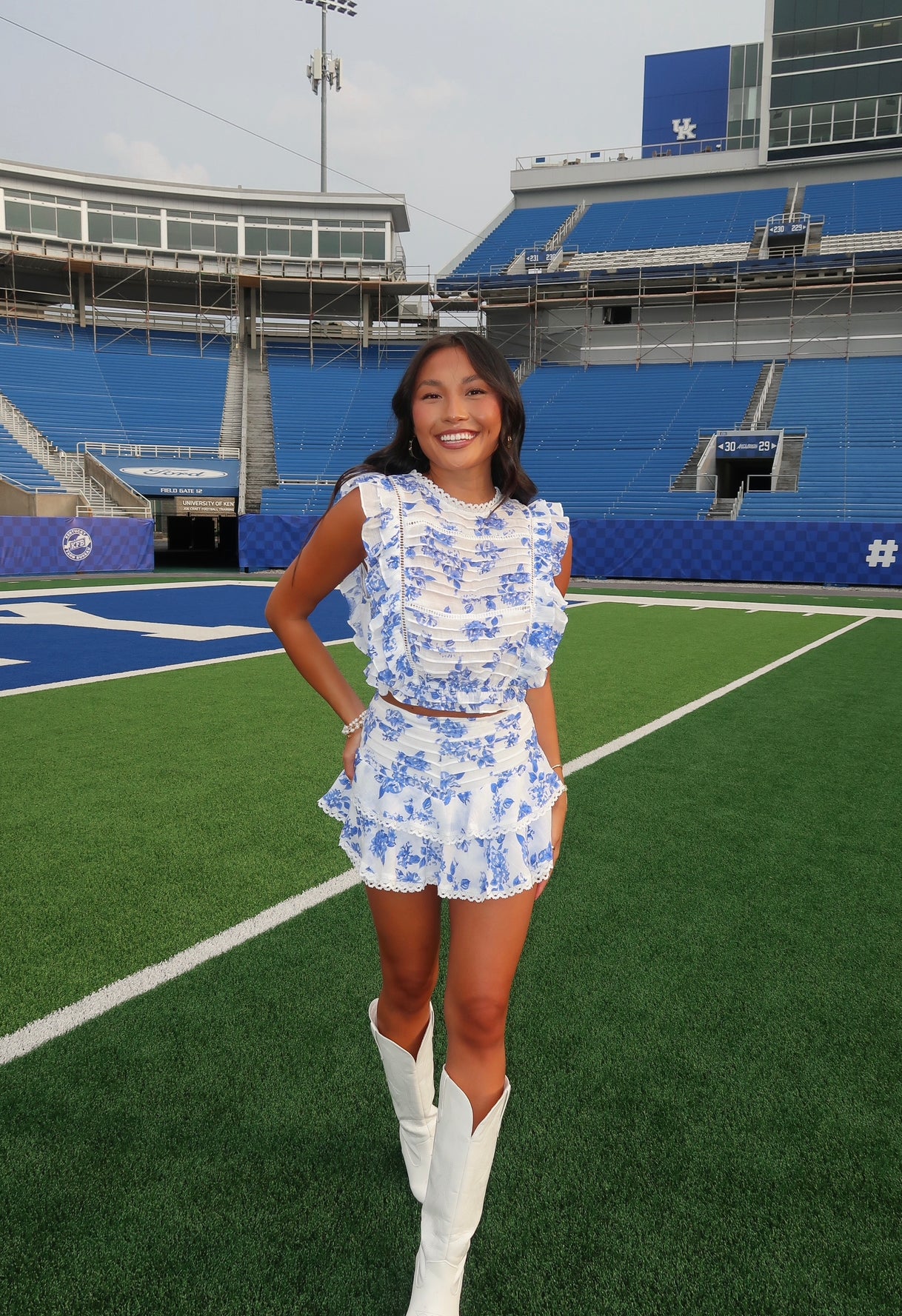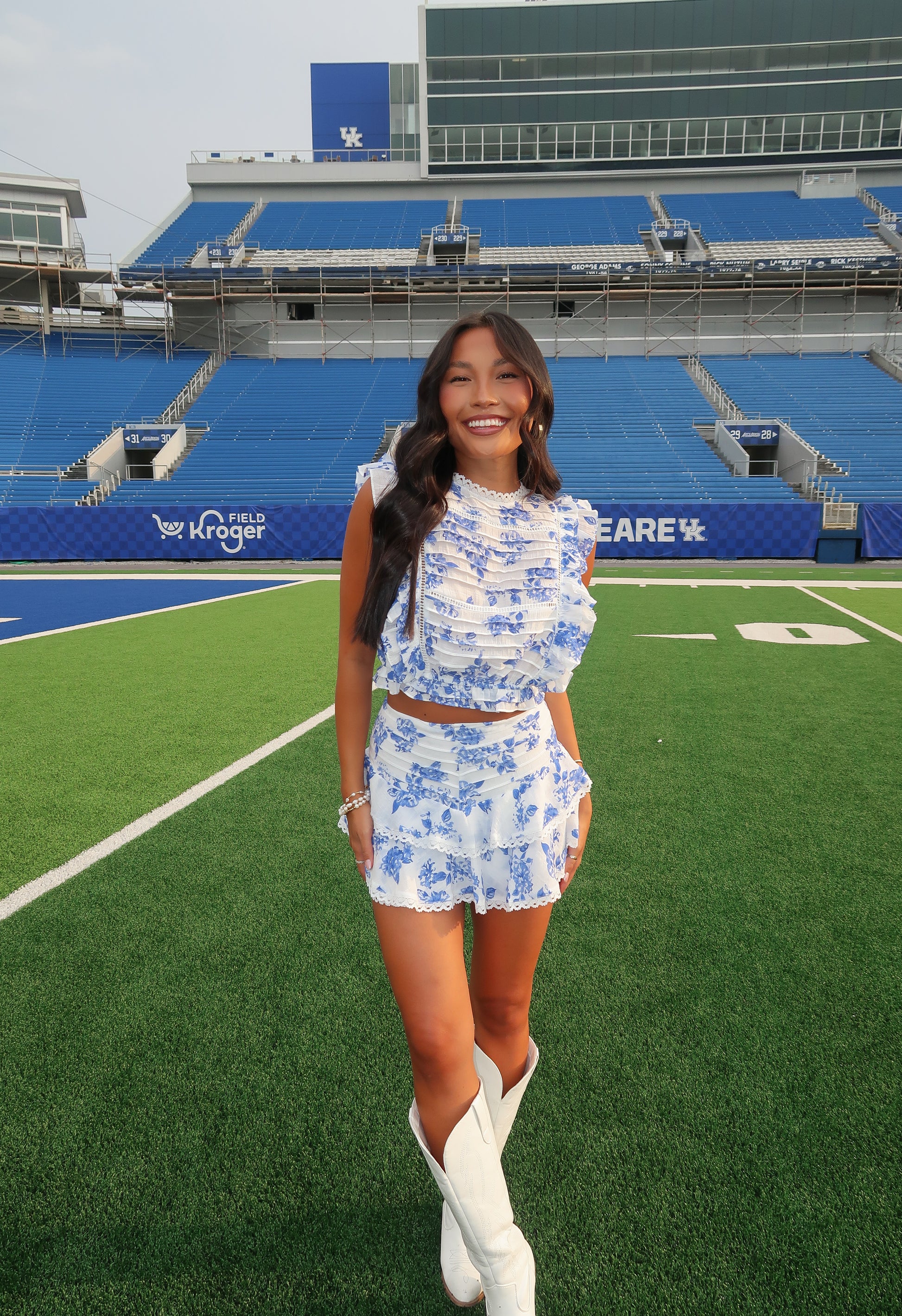 Get ready to steal the show in our Dylan Ruffle Floral Top! This cute crop top has it all - a playful floral print, a chic crochet neckline, and a subtle ruffle detail for a touch of femininity. Made from crinkle gauze and finished with a back keyhole button, it pairs perfectly with white bottoms or our matching Dylan Ruffle Floral Skort.