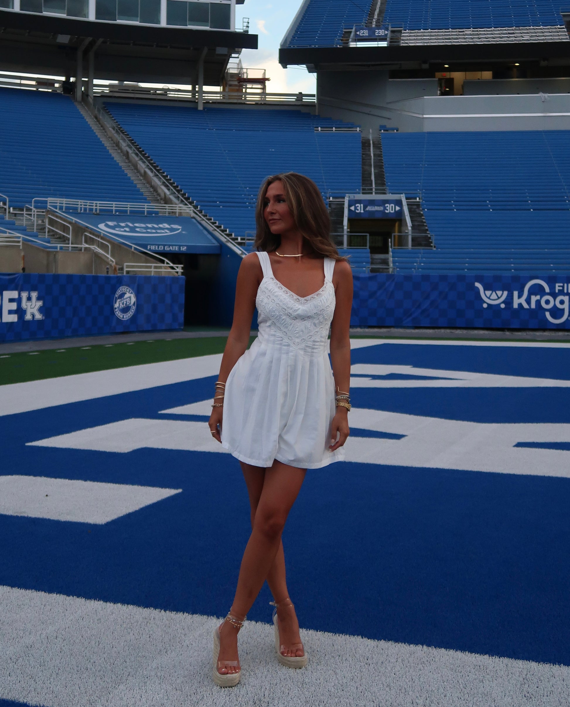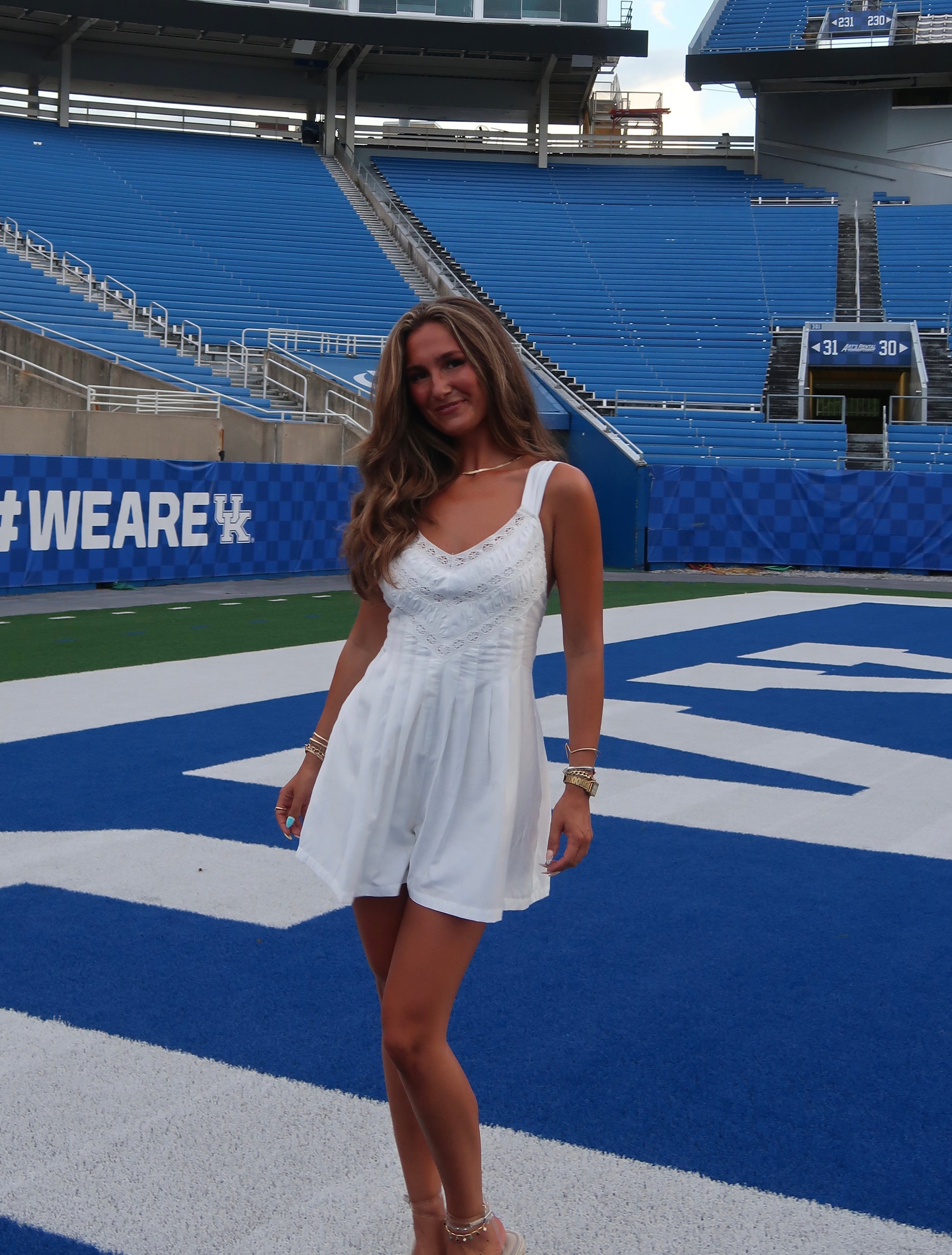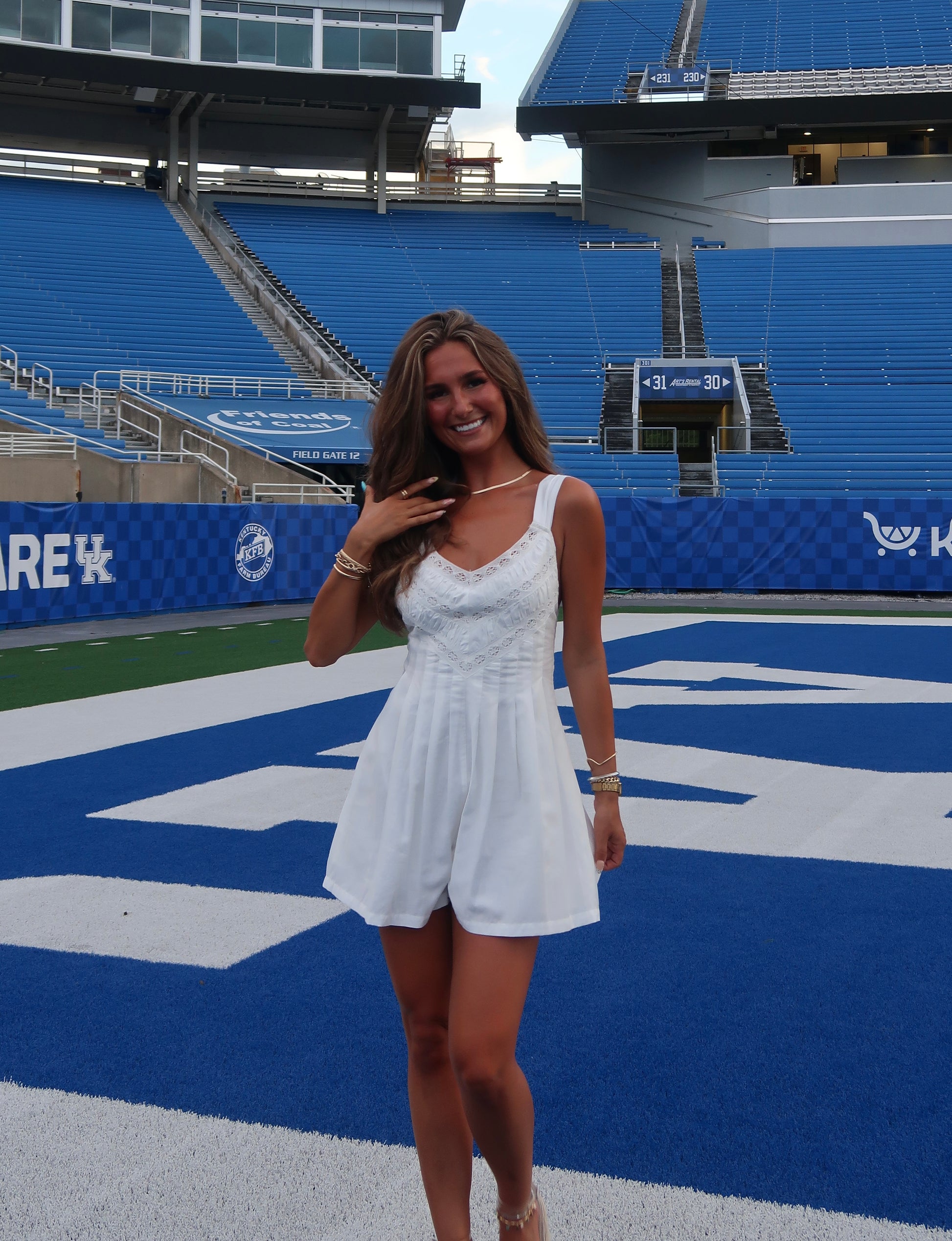 The Emmaline Romper is crafted from a crisp true-white woven fabric and features a delicate lace V-neckline for a feminine touch. Adjustable cross-back straps and an open back add a flirty edge, while the hidden back zipper ensures an easy fit. Fully lined for comfort and coverage, this romper is perfect for gameday, summer nights, or your next event.