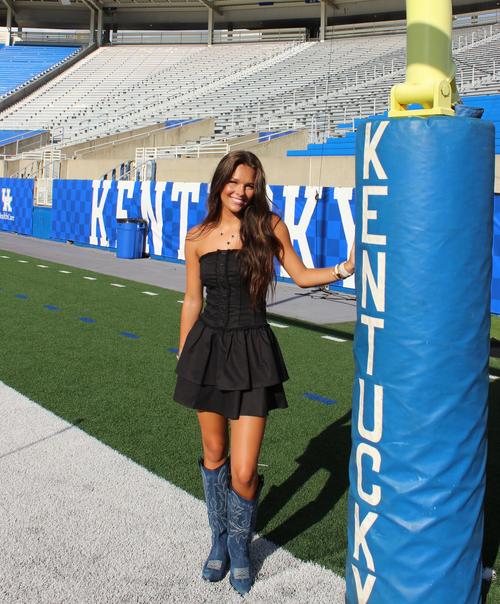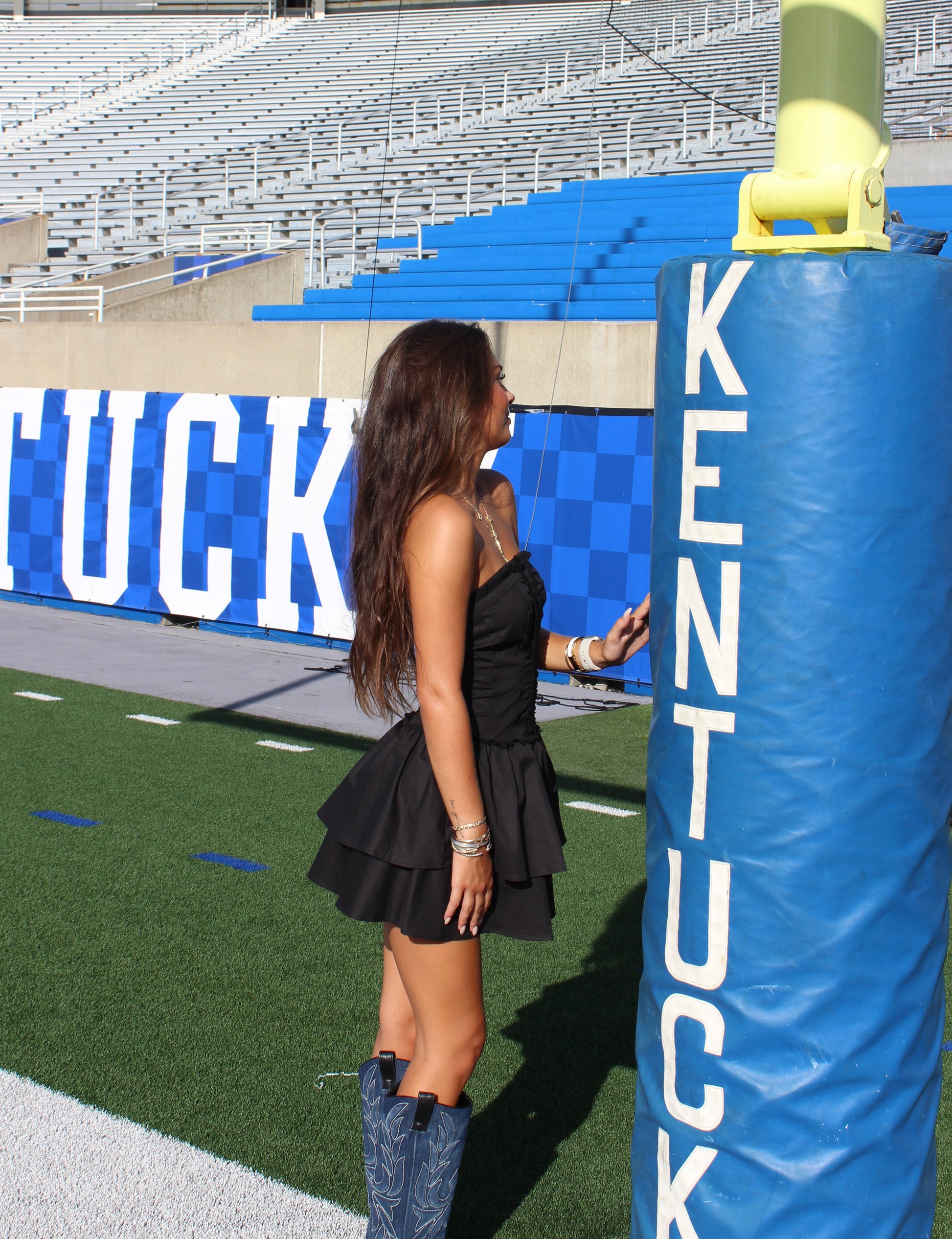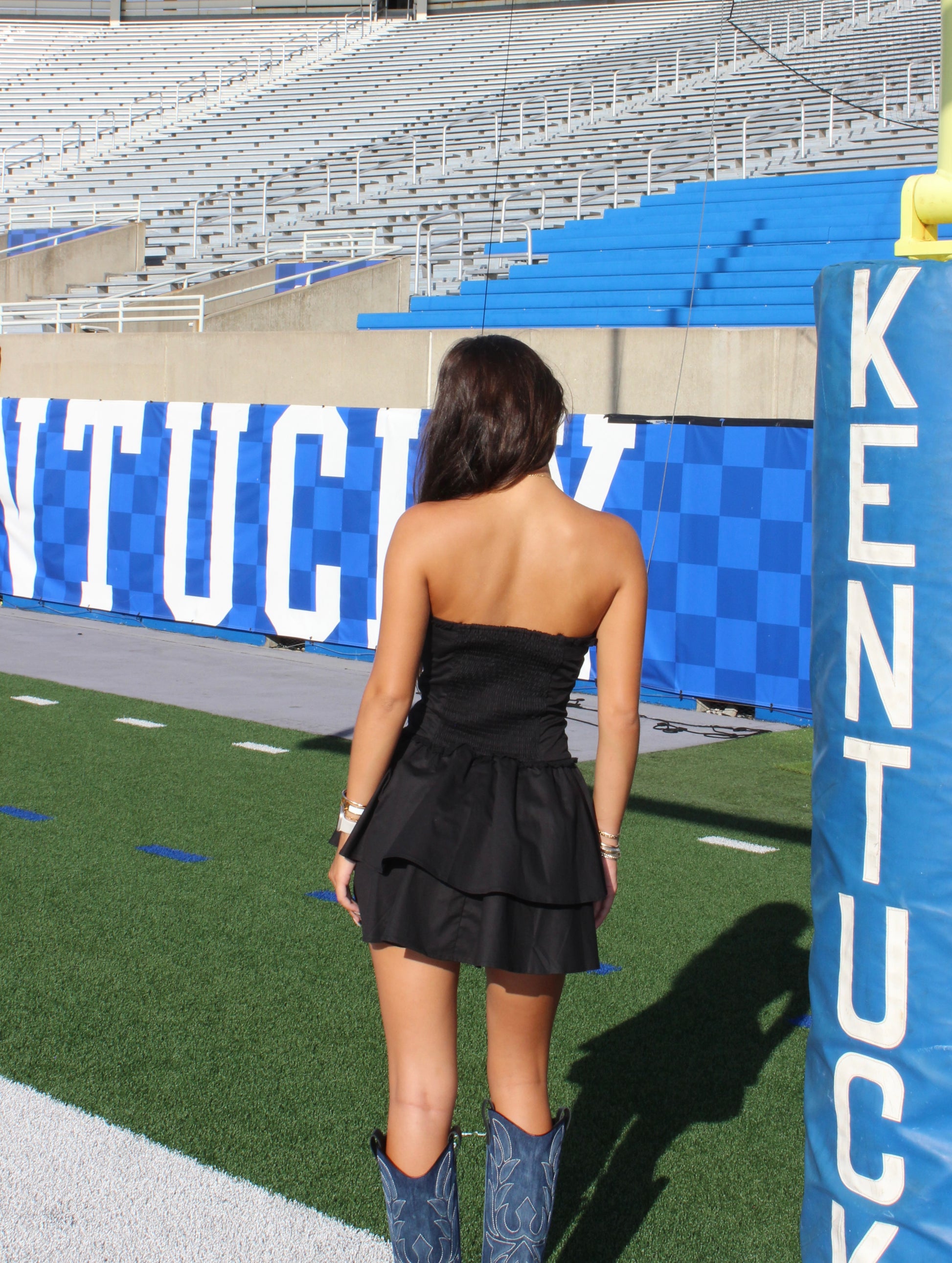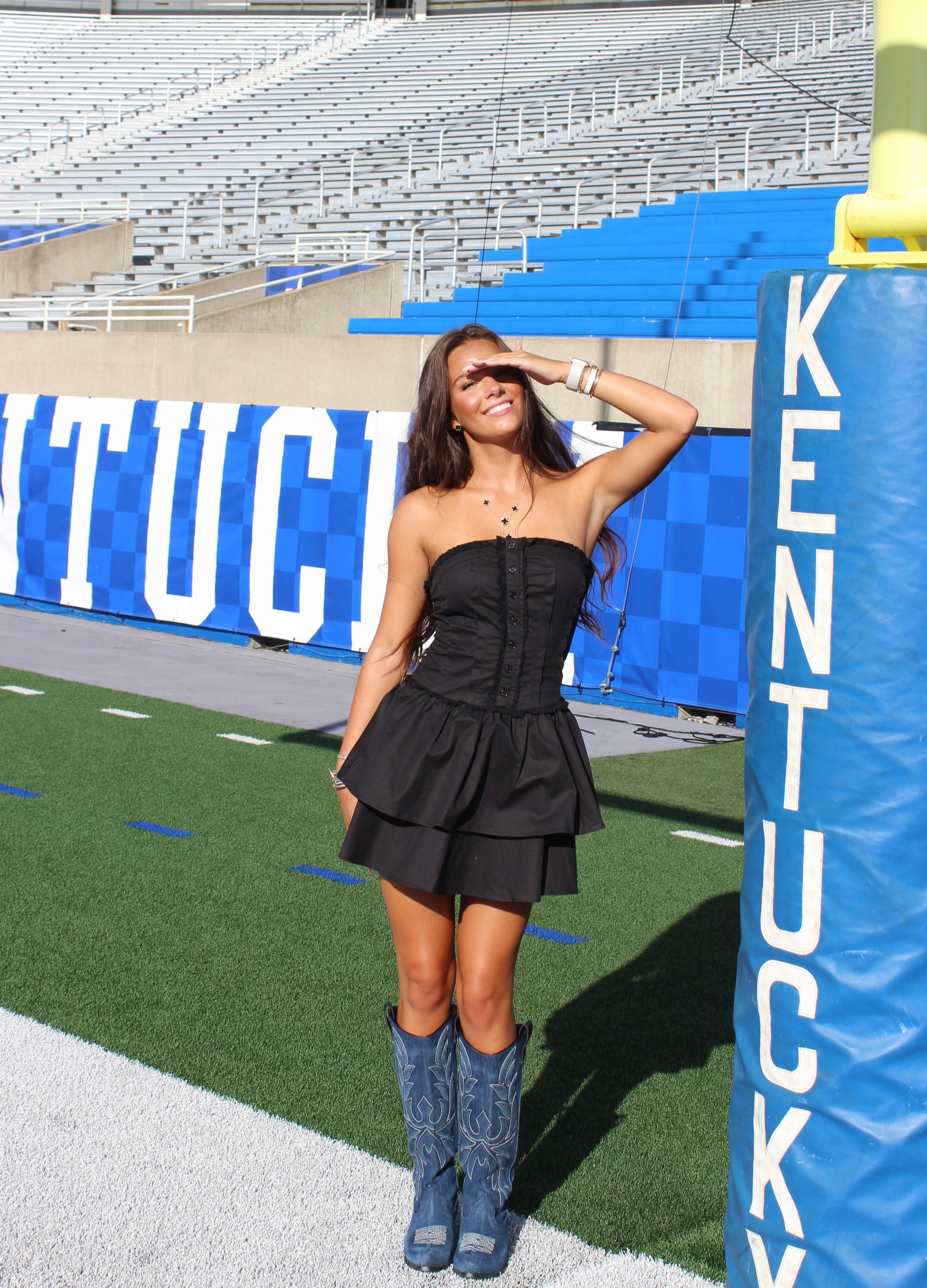 Turn heads in this strapless black mini. Designed with a flattering fitted bodice, button-down front, and a chic drop waist that falls into a tiered skirt, it blends structure with movement. Delicate lace ruffle details soften the edgy silhouette, creating the perfect mix of bold and flirty. Whether you’re headed to a tailgate or a country concert, this look is made to stand out.