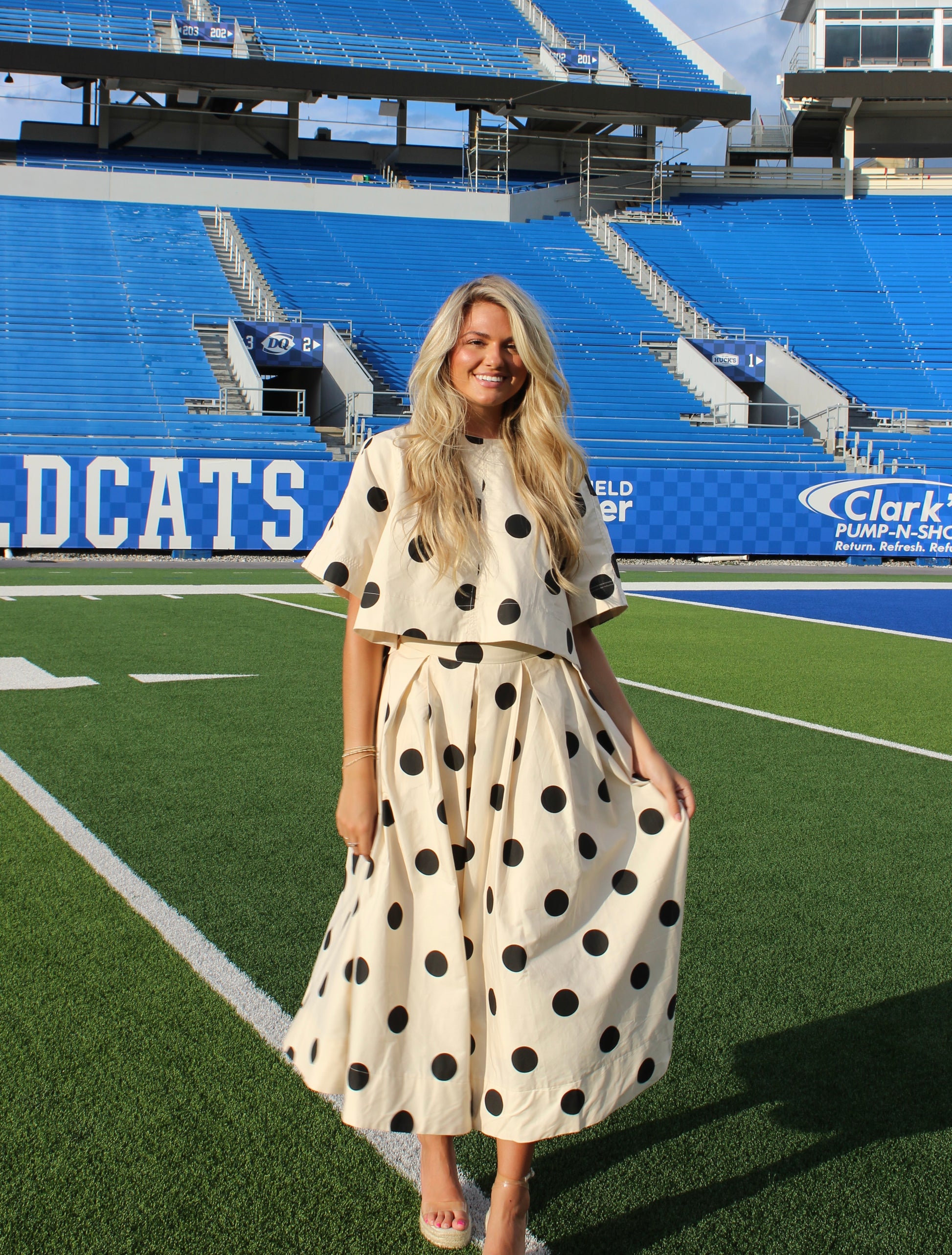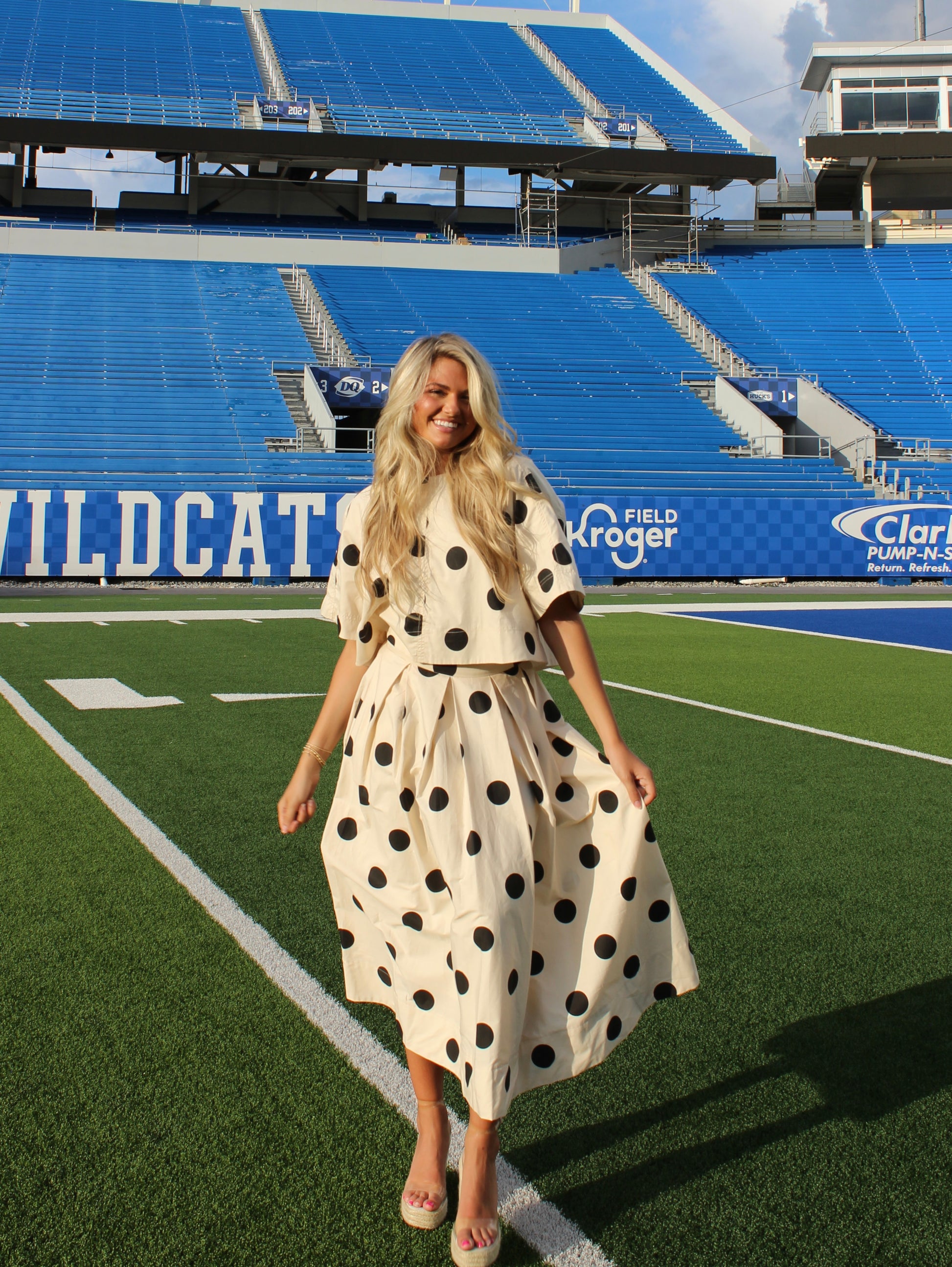 A high-waisted midi with a flattering gathered waist, side pockets (yes, pockets!), and a flowy, feminine shape. The bold polka dot print makes it a standout piece—style it with the matching Lottie Polka Dot Top or your favorite black top for a versatile outfit.