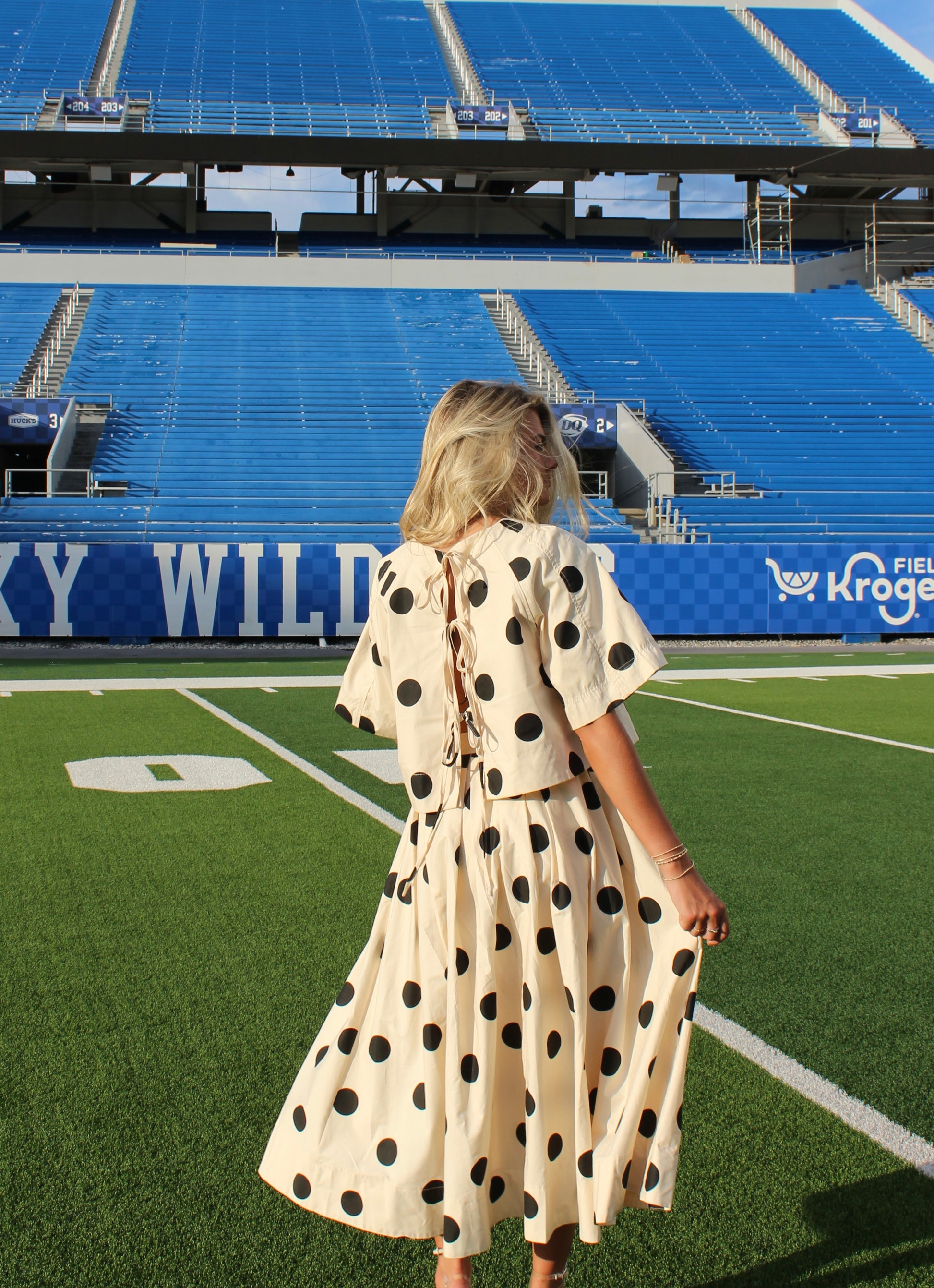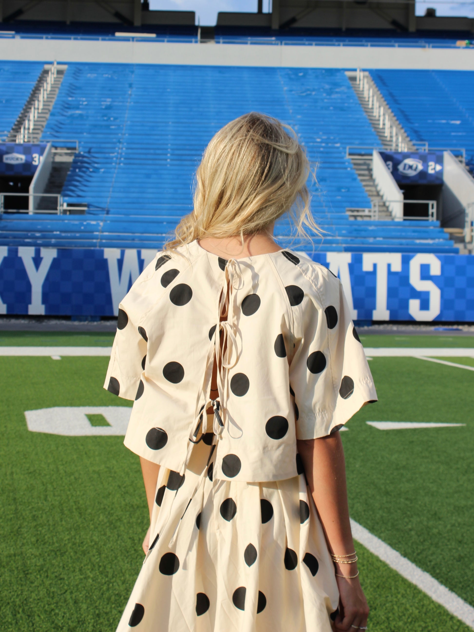 A boxy, cropped silhouette with playful polka dots and an open tie-back detail for an adjustable fit. Easy short sleeves make it an effortless statement piece—wear it with the matching Lottie Polka Dot Skirt or style it with denim for an everyday chic look.