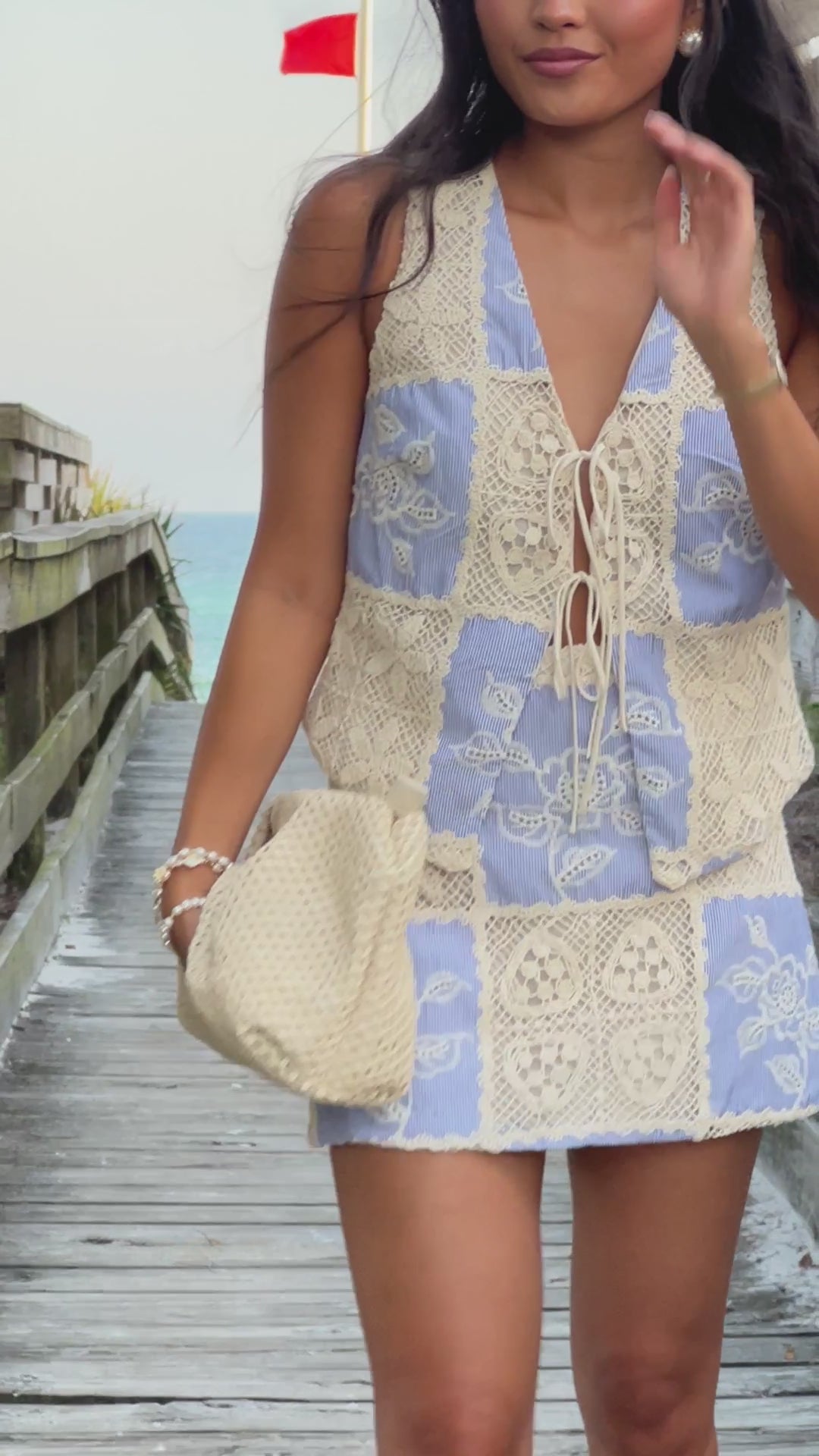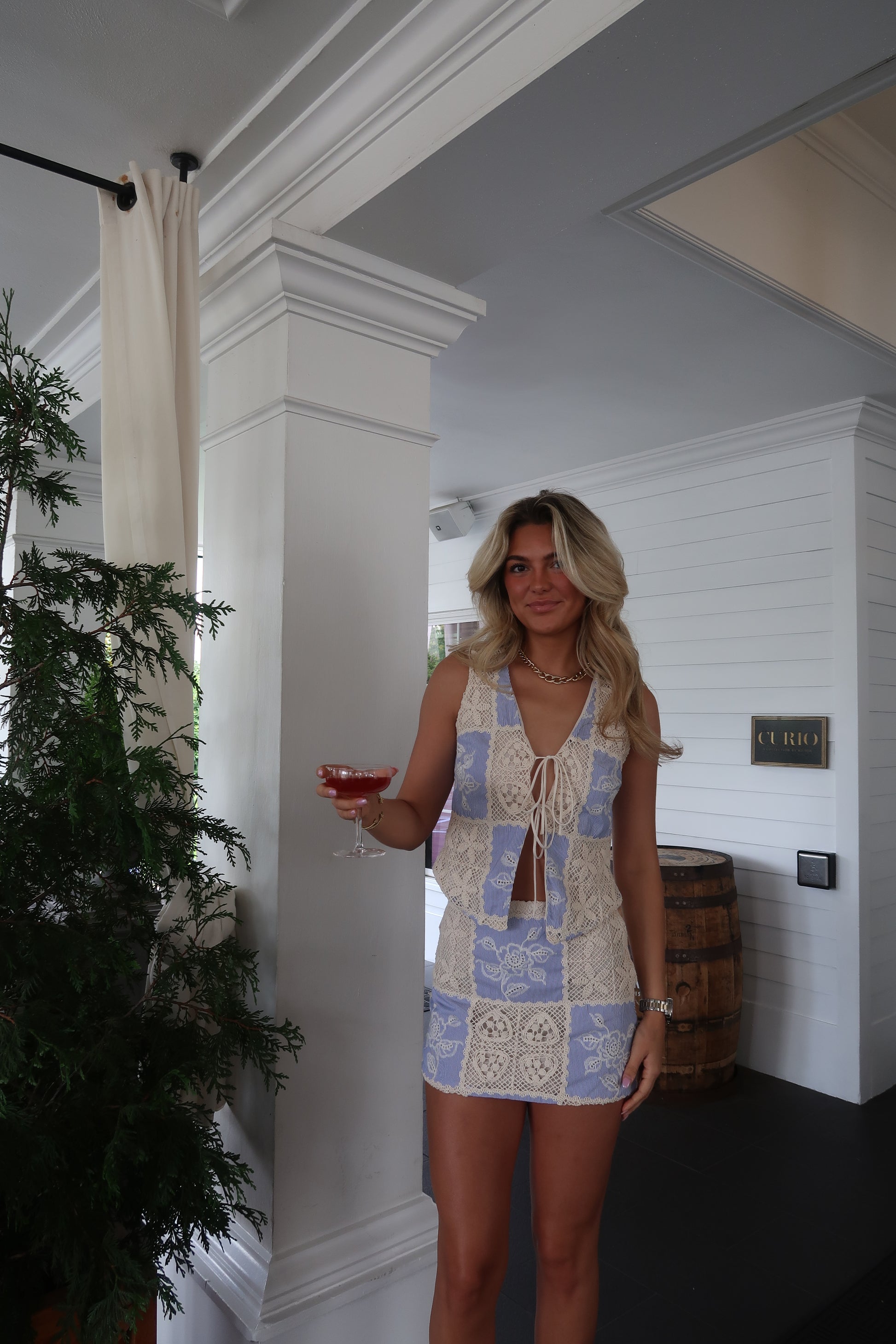 Get ready for a euro summer with our Mykonos Blue Crochet Top! This playful top features a crochet checkered pattern, a tie front and a matching skirt (sold separately). Perfect for your next beach trip or dinner date, the Mykonos Blue Crochet Top will have you looking effortlessly stylish.