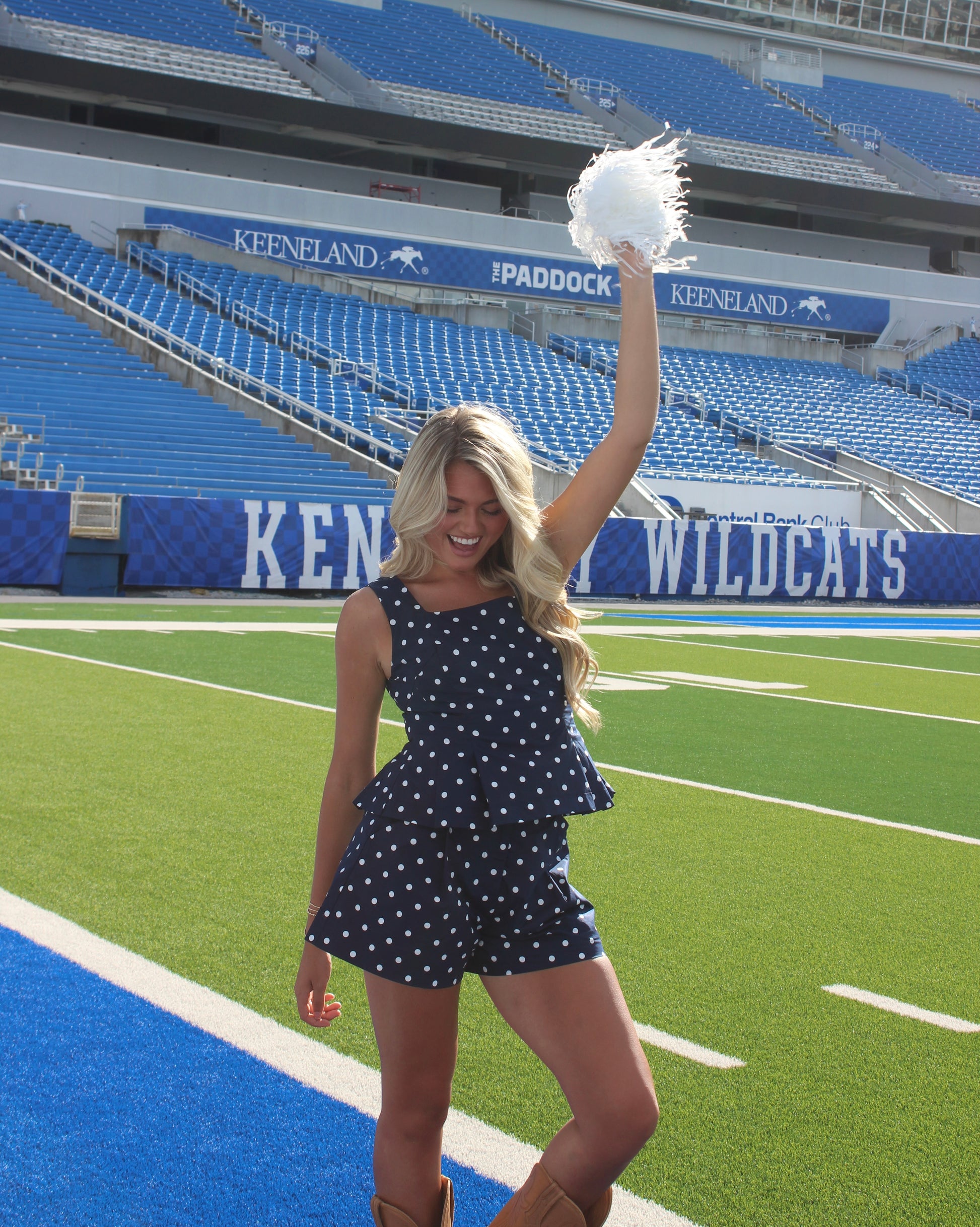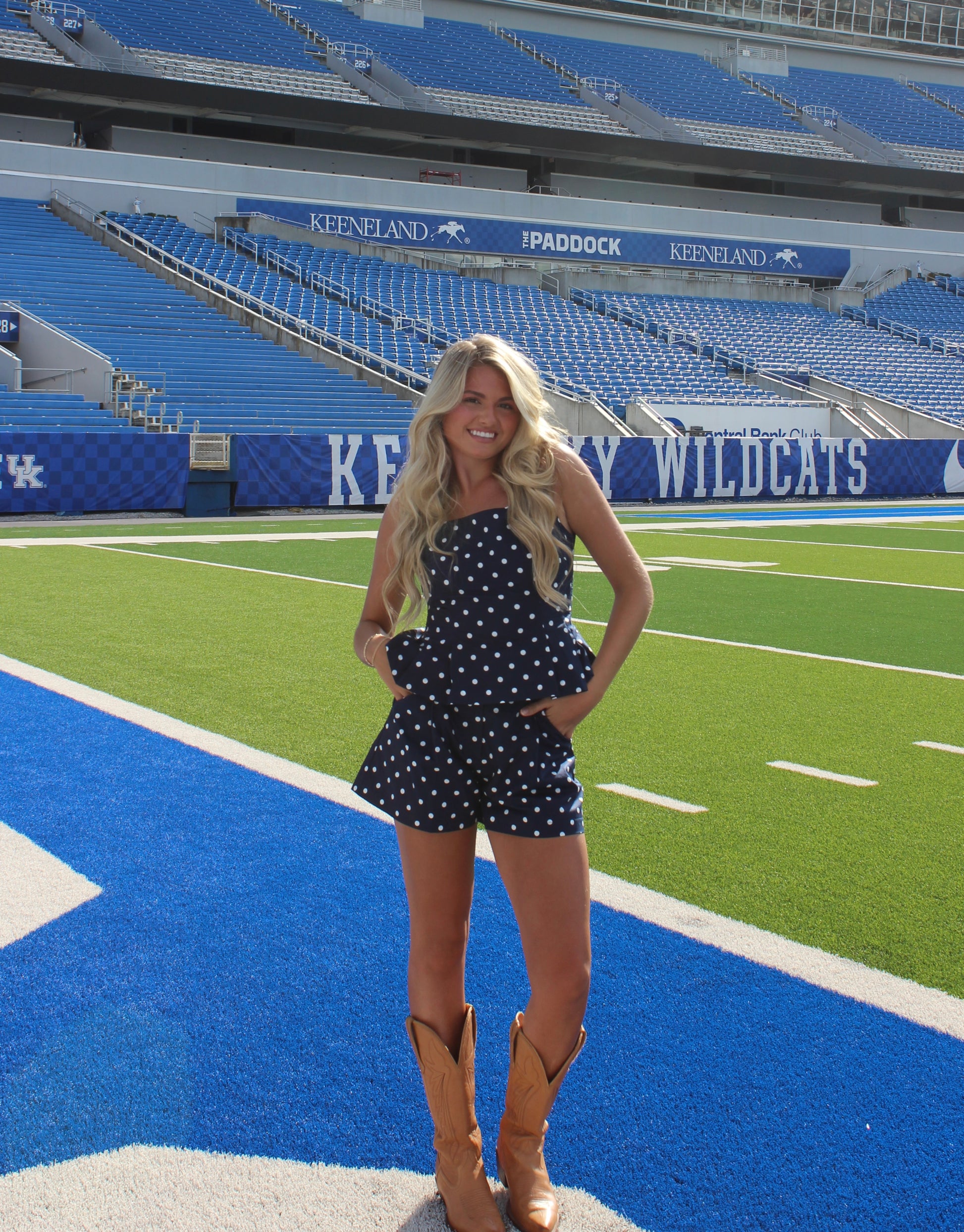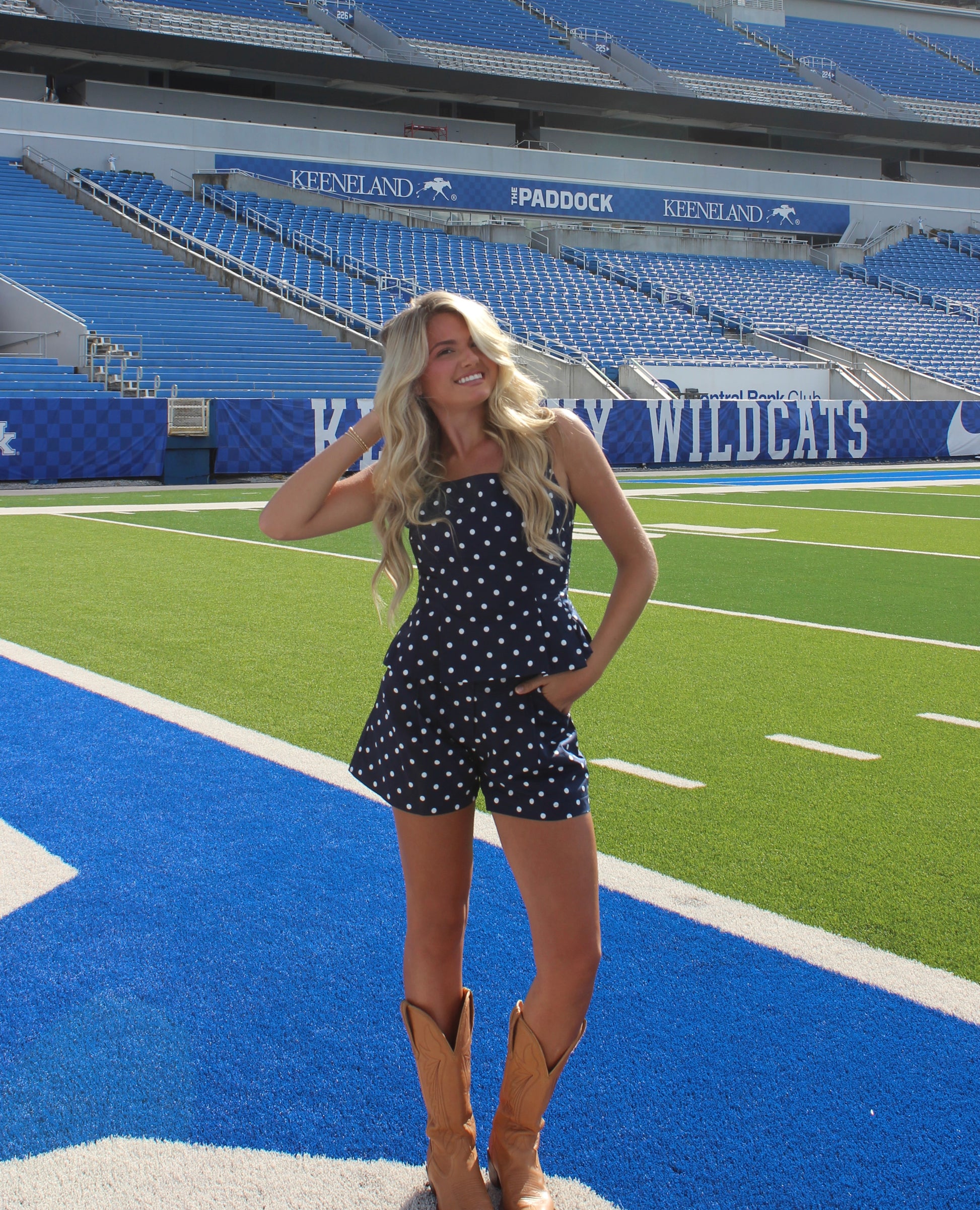 The Demi Polka Dot Pleated Shorts feature a high-waist design that flatters the silhouette while keeping you comfortable. With side pockets for practicality and a 100% rayon construction for softness and breathability, these shorts are perfect for stylish, everyday wear. Pair it with the Reece Polka Dot Top for an effortlessly chic gameday look.