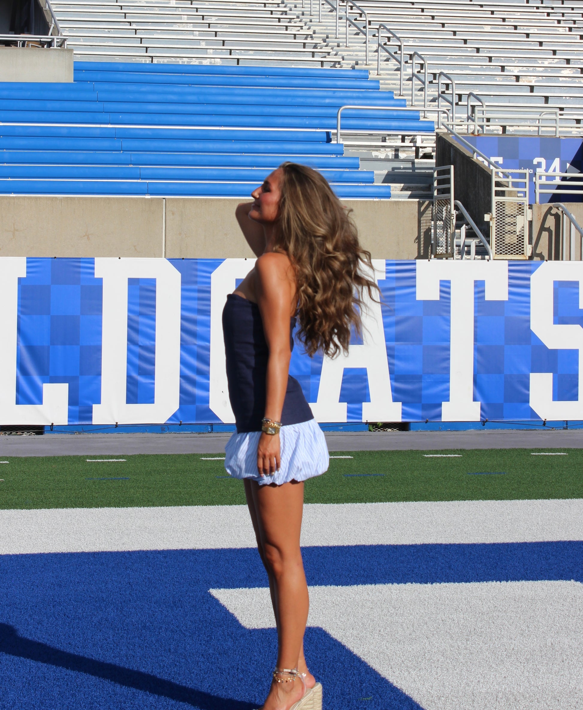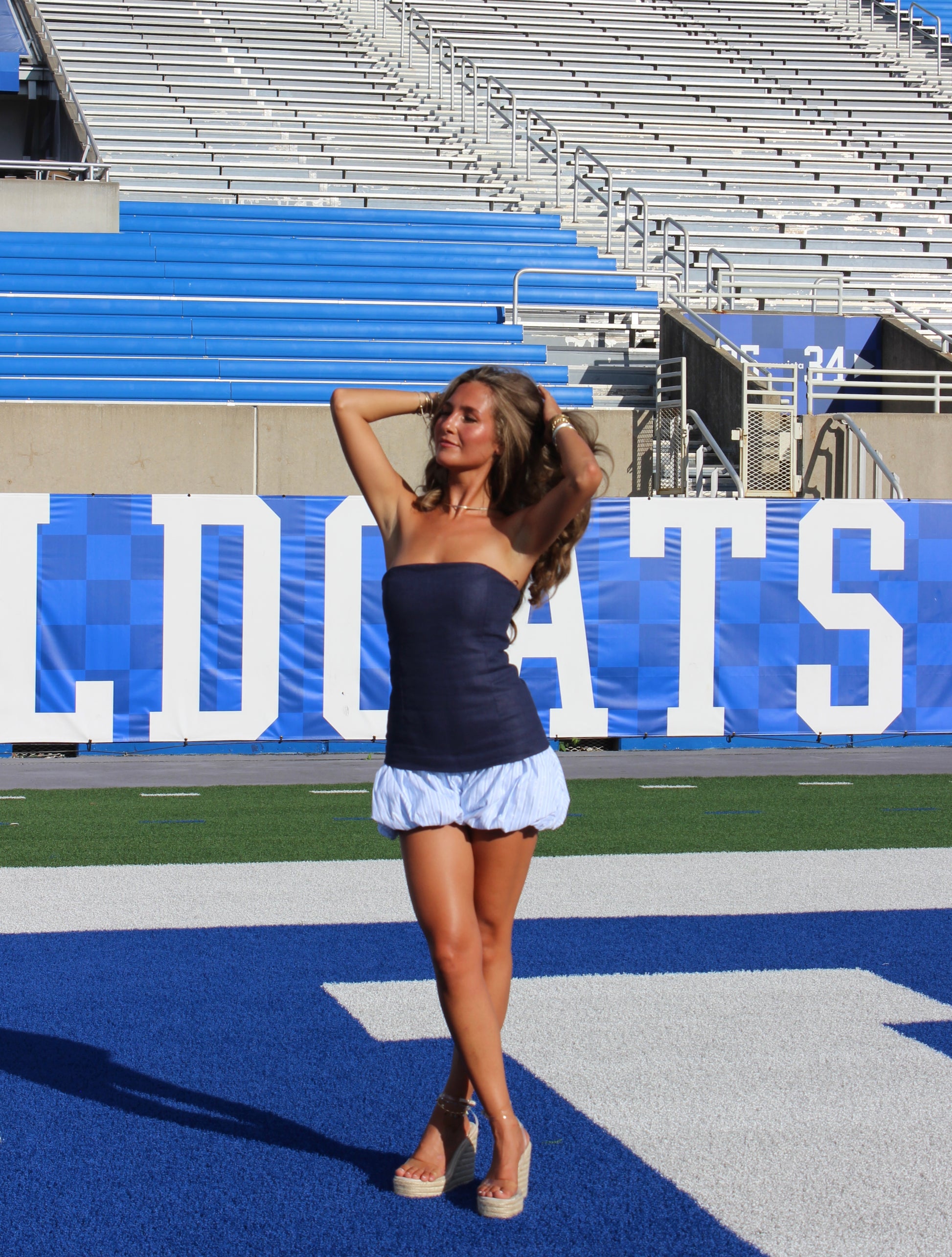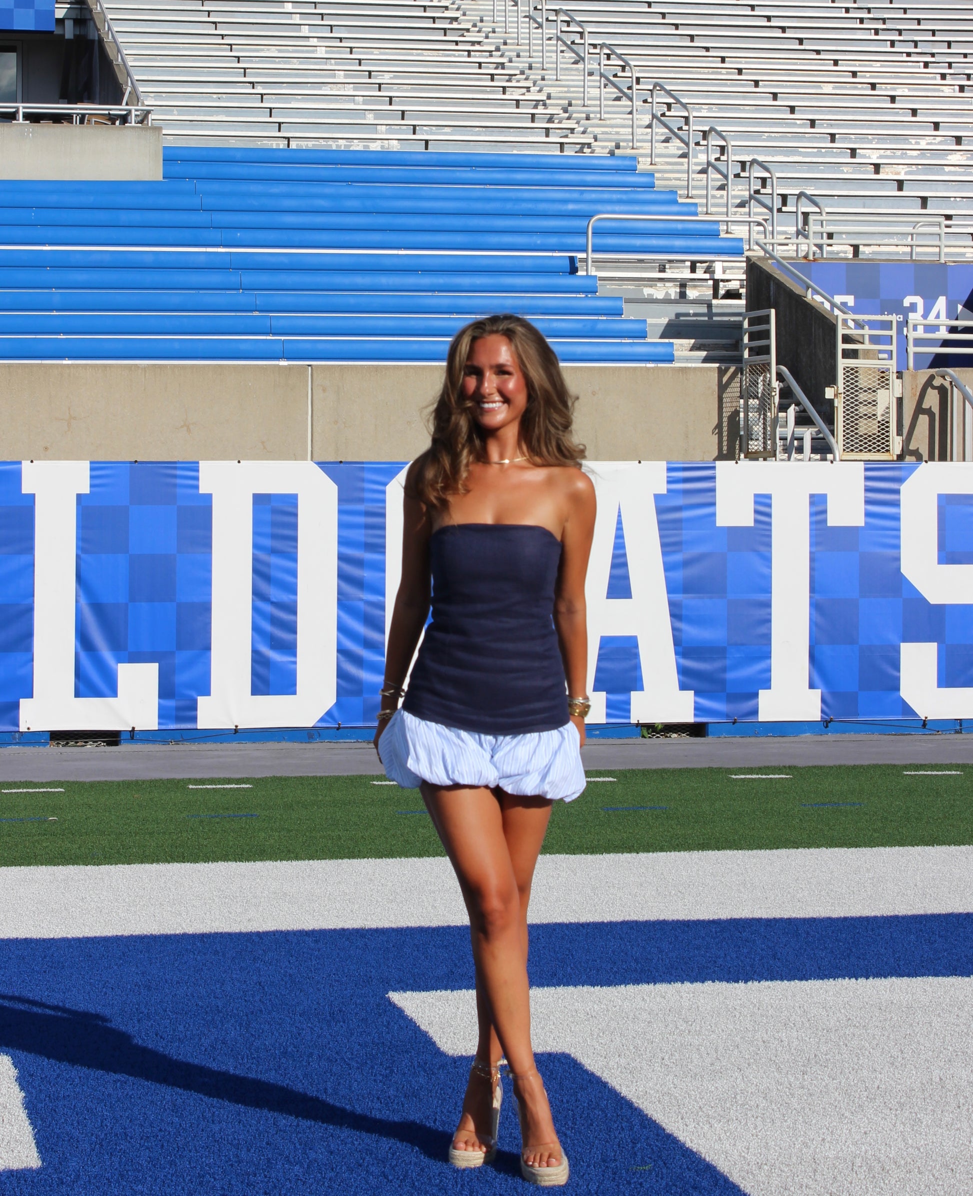 Bring the energy with the Spirit Bubble Romper from Line & Dot. Made from a luxe cotton-linen blend, this strapless navy romper features statement contrast bubble hem shorts for a playful twist. A hook-and-eye closure with hidden back zipper ensures a sleek fit, while the fully lined interior keeps you comfortable from tailgate to night out.